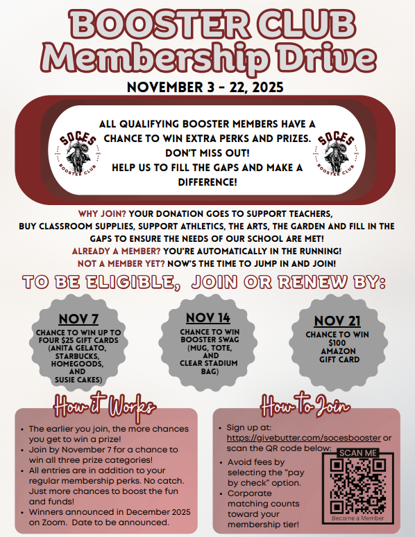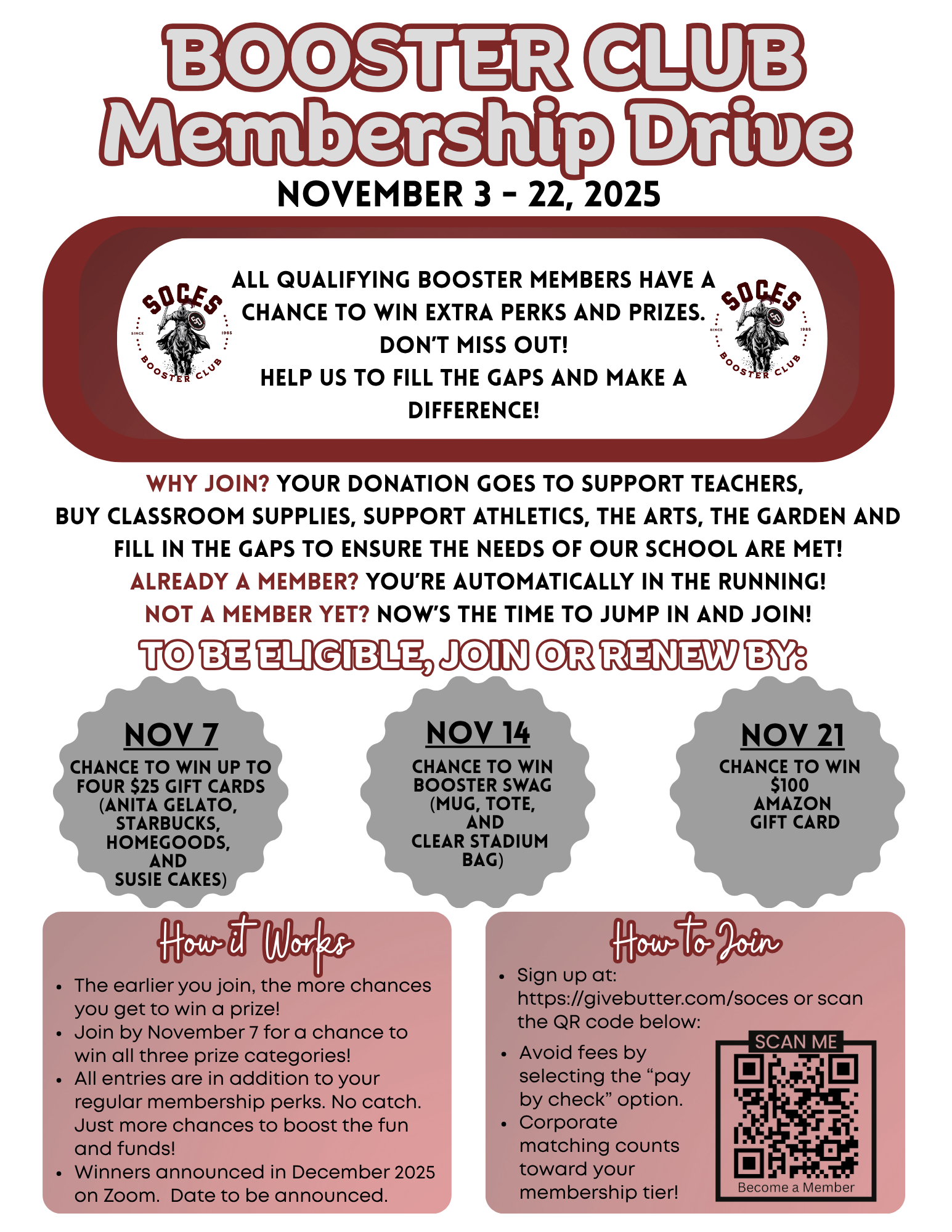 The SOCES Booster Club Membership Drive is from Nov. 3-Nov. 22 and we have a big goal of $25,000! So far we’re about 40% of the way there. Join now! How does your membership help? Booster Club membership helps pay for classroom supplies, after school stipends for teachers, equipment for athletics and P.E., band competitions, books, science materials, the garden, fill in the gaps from LAUSD funding to ensure the needs of our school are met and much more! We can’t do it without your help. See the flyer for more details.