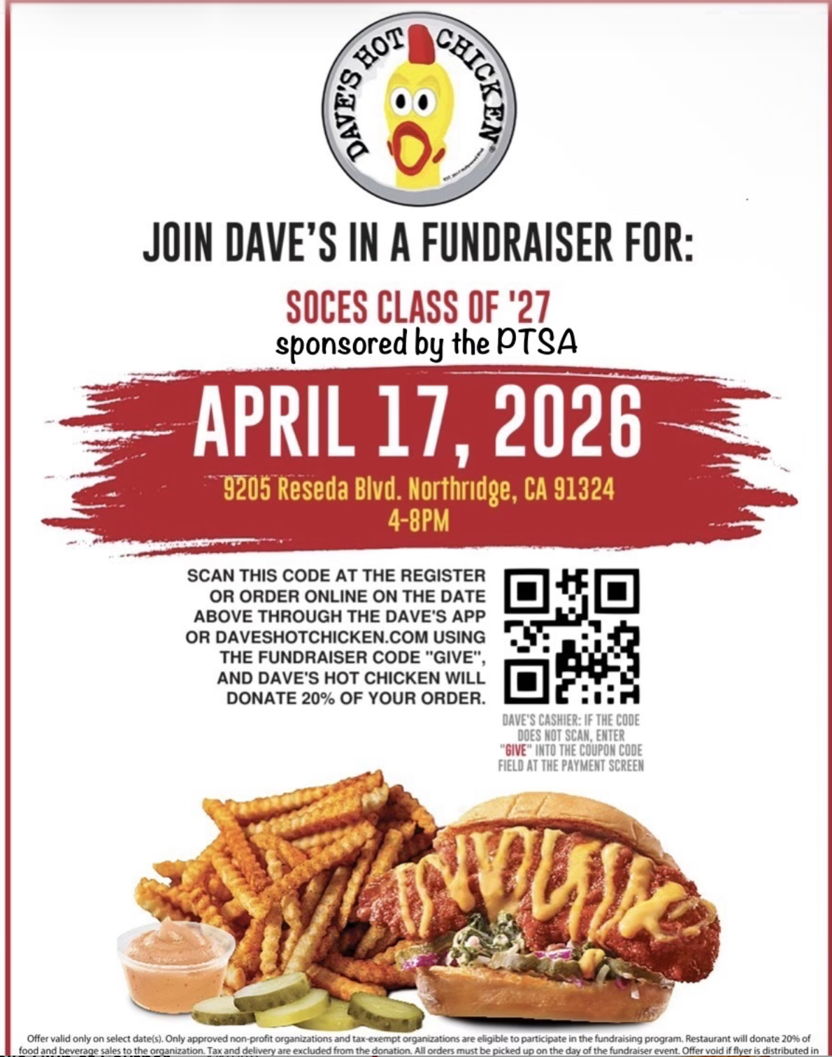 Support our Class of 2027 on April 17, 2026 as they prepare for a busy and expensive Senior year. Dine in or take out – Either way, you’re supporting the SOCES class, and all proceeds will go towards Senior events.