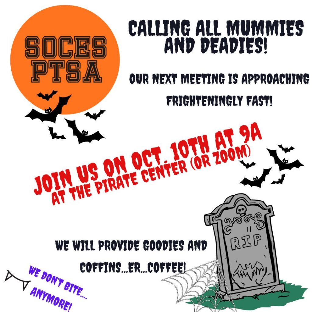 Join us on Friday, October 10th at 9am for our next PTSA meeting!! Learn how you can be involved, get your burning questions answered, and meet fellow SOCES parents! Refreshments will be served! If you can’t come in person, we hope you’ll join us on Zoom for the meeting. Details below…