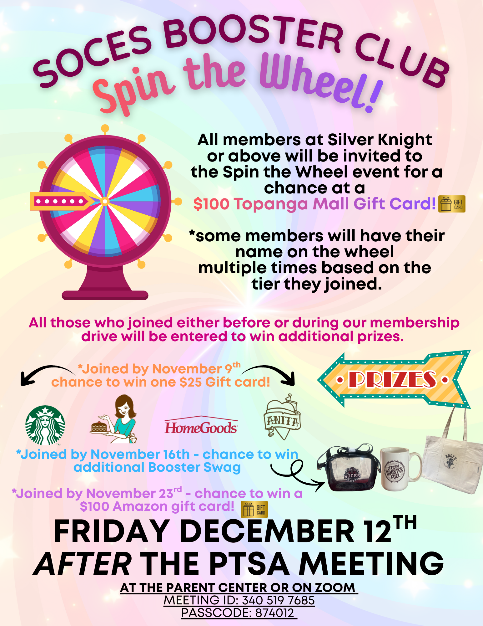 Join for this exciting Booster Club update after the PTSA meeting on Friday, December 12th! You can join in the parent center or on Zoom! Meeting ID: 340 519 7685 Passcode: 874012