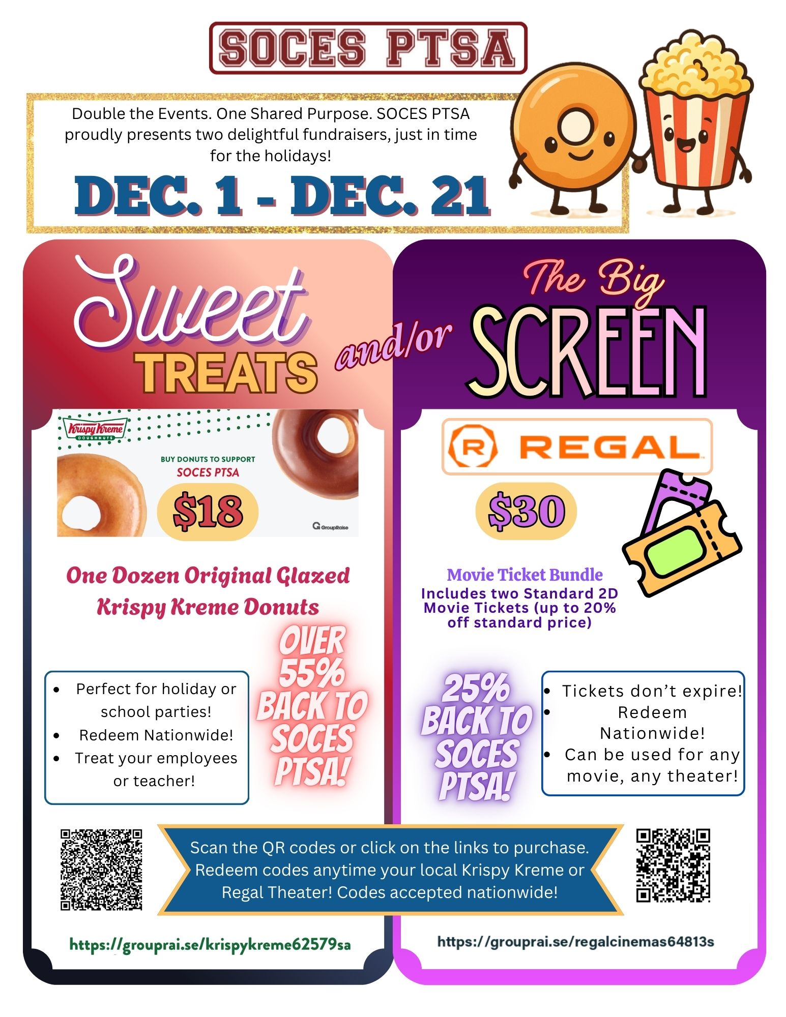 Join our FUN-raiser and enjoy two of life’s delicacies – donuts and movies! Running from Dec. 1 – Dec. 21st, you can purchase both goodies at a fraction of the cost and the SOCES PTSA will receive a percentage back from Krispy Kreme or Regal Cinemas.